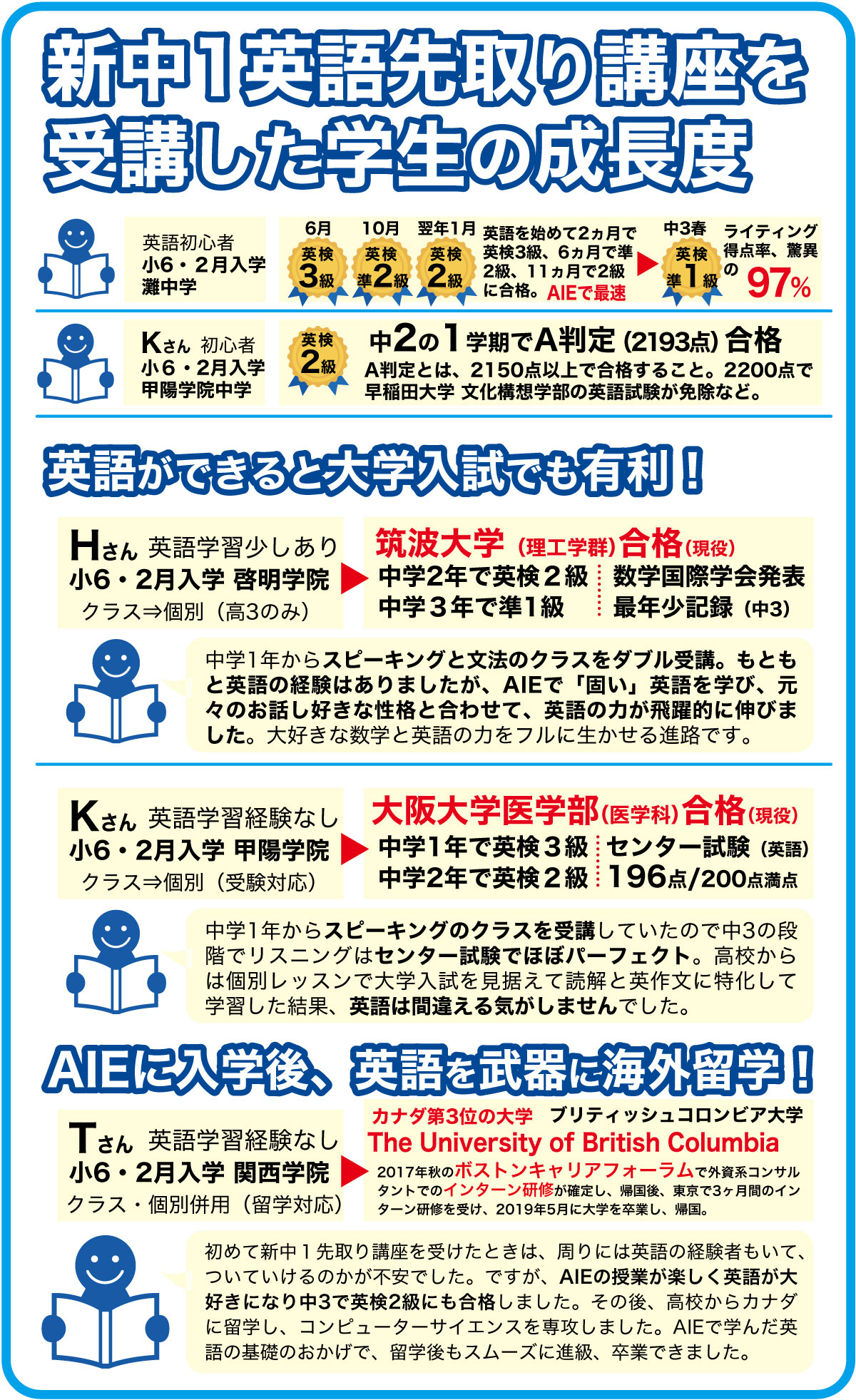 AIEでは、2月の「新中1生のための英語先取講座」からスタートし、4月から本科コースがスタートします。先取り学習を基本としているため、AIEで学び、その後に学校でも同じ内容を学ぶため、余裕をもって学びをスタートすることができます。私立中学のレベルに合わせてコース設定もされているため(必ずしも所属する学校によってコースが決まるわけではなく、レベルチェックの結果でコースが決まります。)、安心してクラスに合流してください。